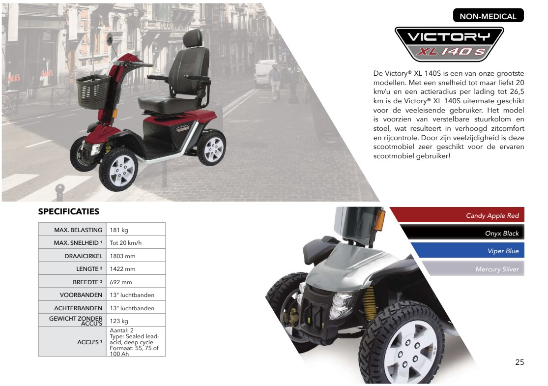 De Pride Victory Xl140 is het grootste model onder de nieuwe generatie Scootmobielen. Met een actieradius tot 45km en een topsnelheid van 15 km per uur is de Victory XL140 van Pride Mobility een Scootmobiel voor de veeleisende scootmobielgebruiker.